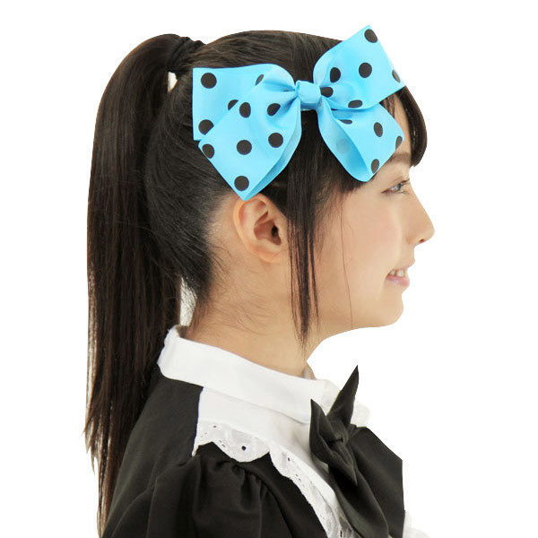 鮮やかなブルーリボンに黒いドットをプリントしたコスプレ向けヘアアクセサリー単品。