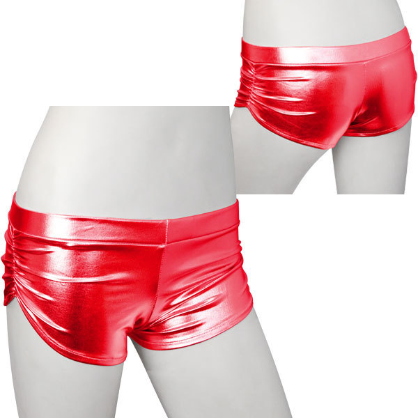 ●シャイニーなメタリックレッド●両サイドギャザーデザイン●伸縮素材でヒップラインを強調。