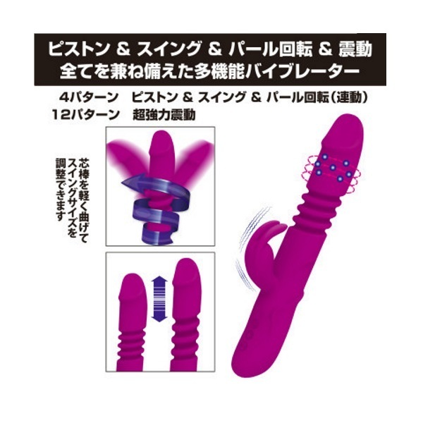 ●医療グレードの滑らかシリコン●約1.5cmほどの伸縮ピストン機能●スイング幅の調整可能な芯棒入り●うねうねと刺激するパール回転●各機能の調整は4パターン(連動)●クリバイブ振動は12パターン●生活防水仕様で衛生的に使用可。