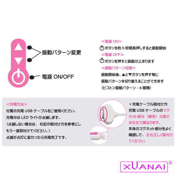 約2.5時間のフル充電で最大45分稼動するUSB充電式バイブのxuanai!ワンタッチ着脱のマグネット式充電ケーブルも付属しています。