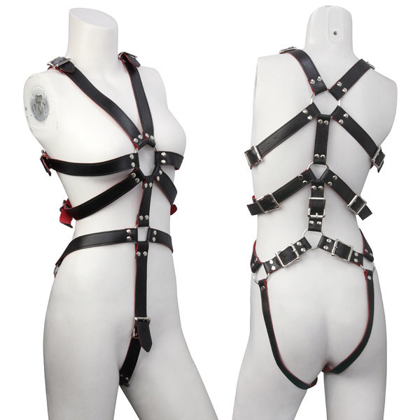 亀甲縛りのようなデザインで緊縛感も味わえるSMプレイスーツ!各ベルトでサイズ調整可能、材質はフェイクレザー・鉄。