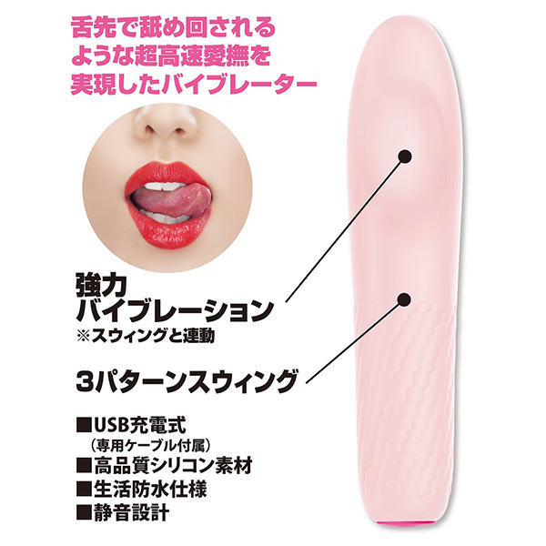 ただ入れて掻き乱すだけのバイブとは違い、高品質シリコン素材のなめらかボディが膣内を愛撫するように高速スイング!舌先の強力なバイブレーションと連動し、膣の中をビチビチと叩きながら、敏感な部分をこれでもかと言わんばかりに責めたてます♪もちろん膣だけでなく、クリや乳首にも使用が可能!これ1つあれば色んな使い方で楽しめちゃう♪また、生活防水機能が備わっているから、使い終わったあとは水洗い出来てお手入れ楽々!電池の要らないUSB充電式で、付属の専用ケーブルで120分間充電すれば、およそ90分間の連続稼動が可能となっております。
