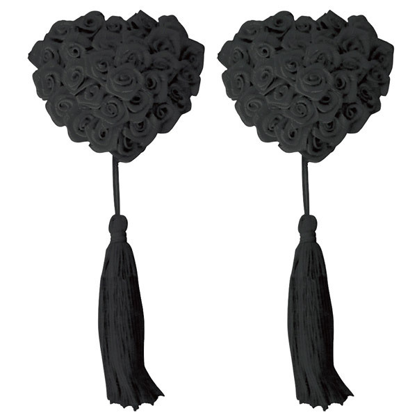 真っ黒なバラで贅沢にデコレーションしたハート型ニップルと、ゆらゆら揺れるタッセルを組み合わせたゴージャスなデザインは、ショータイムやナイトパーティーにも最適です。
