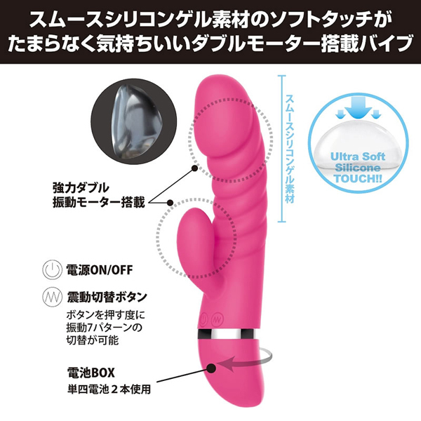 先端からちょうど真ん中までがグミのような人肌に近い素材のシリコンゲルを使用しており、挿入した瞬間からその柔らかく心地よい弾力感が通常のバイブとは異なった挿入体験をさせてくれます♪胴体は波打つようなウェーブデザインで、出し入れするたび膣壁を擦りあげ、さらに先端と子機に内蔵された強力なモーターが7パターンの振動で外・内を同時に刺激。