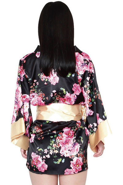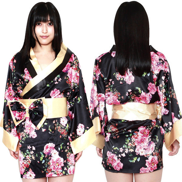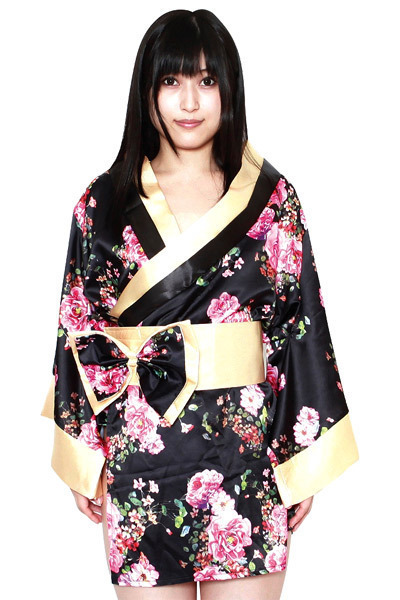 花魁よりも位の高い太夫をイメージした金×黒の豪華なミニ丈着物♪ピンクの華が咲き誇る黒い着物をゴールドの帯でビシッと締めれば高級感漂う花魁風コスプレに。
