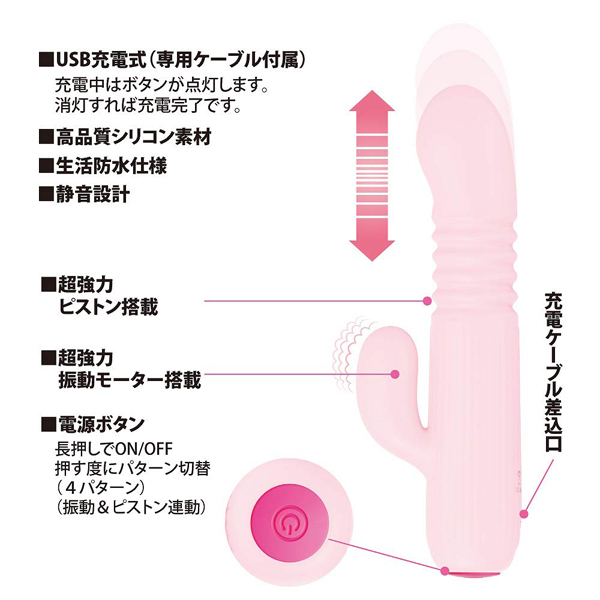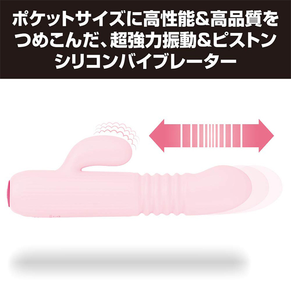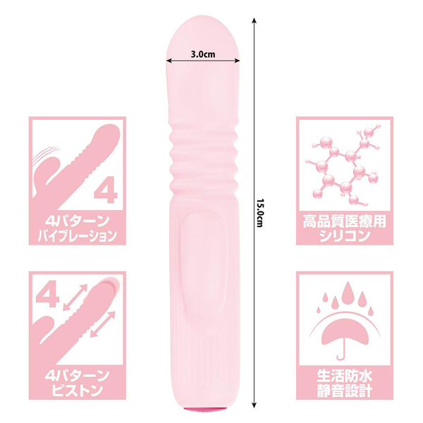 超強力振動と力強いピストンでポルチオ直撃の超絶快感!ハイスペックを小さなボディに詰め込んだ究極のピストンマシーン!ボタン1つで簡単操作可能●4パターン震動+ピストン●メディカルグレードシリコン●生活防水●USB充電式(コード付属)