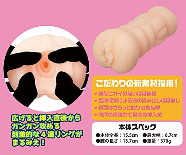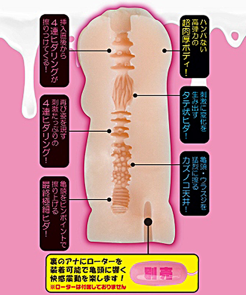 ハンパない高弾力の超肉厚ボディで挿入直後から4連ヒダリングが擦り付けてくる!刺激に変化を生み出すタテ状ヒダに、亀頭・ウラスジを猛烈に擦るカズノコ天井と亀頭をピンポイントで擦り上げる最終極細ヒダ●ローターポケット付きでローターを装着して楽しめる●ローション付