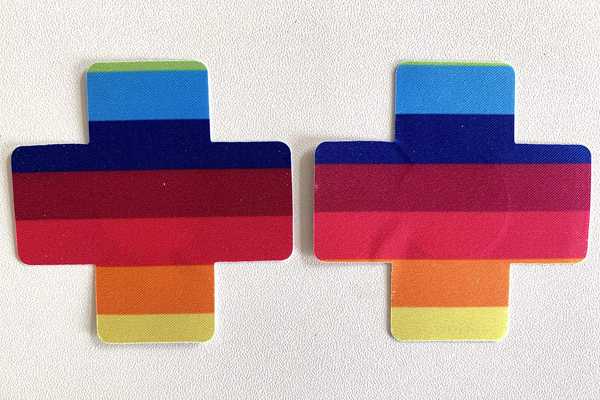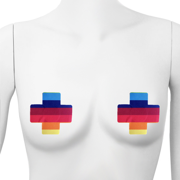 カラフルな虹が胸元を可愛く彩る十字型のニップルシール(レインボー)。