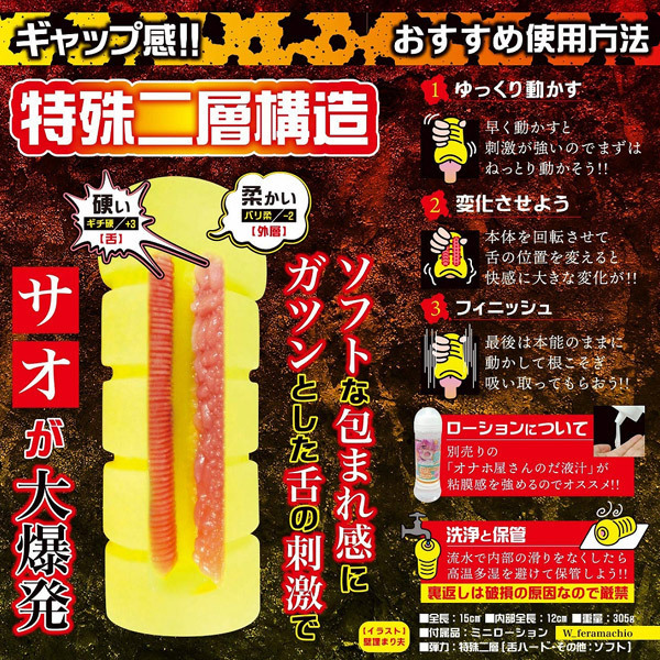 舌だけが固い「特殊二層構造」で大ヒットとなった「フェラ魔チオ」に待望の続編が登場!!ザラついた舌が…這ってゾクゾク ボコついた舌が…絡んでビクビク人では味わえないダブルフェラを楽しめる新感覚オナホール!!でも…気を付けてくださいね?「