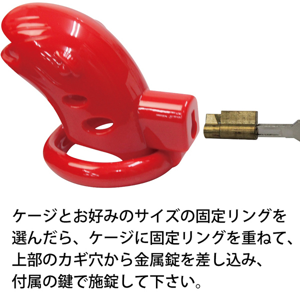 固定リングと全長7cm、内径3.5cmのケージを組み合わせて勃起を徹底管理!上部にある鍵穴から金属錠を差し込み、付属の鍵で施錠してお使いください。