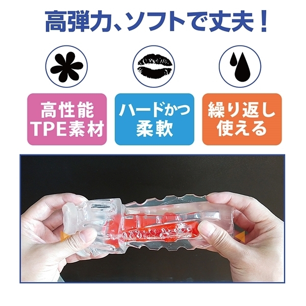 こちらは挿入直後からのコブやブロックのようなヒダ、最奥の尿道を突き刺すように待ち構える突起が特徴の超ハードな刺激タイプ!絞り込まれるような超快感をぜひお楽しみ下さい。