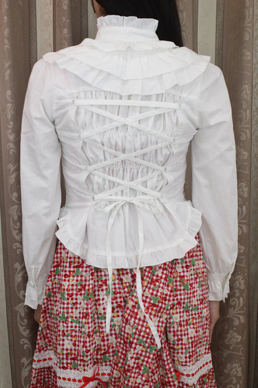 襟元のフリルがとっても可愛く、肌触りが良いので着心地も良好!バックはシャーリングの入った編み上げになっていて、ゴスロリやコスプレ衣装とも相性ぴったり!一枚は持っておきたいキュートなブラウスです。