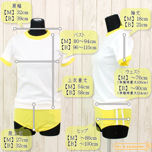 BIGサイズ B96〜110cm・W〜90cm(伸縮時最大114cm)・H〜100cm 上衣:着丈58cm・肩幅39cm・袖丈21cm ブルマ:股上丈32cm