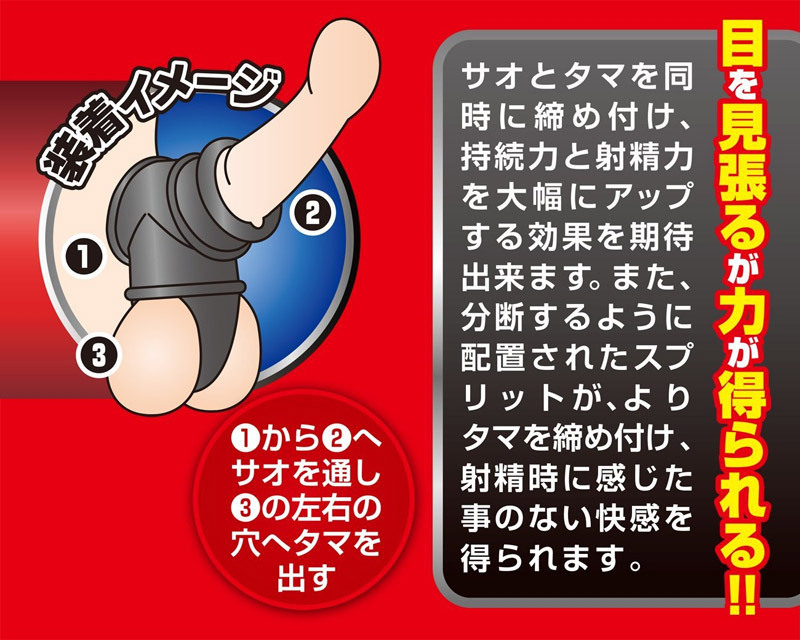 ●伸縮自在で強力フィット●締め付け過ぎない尿道ポケット付き●サオ&玉袋を同時に締め付け●分断するように配置されたスプリットが玉袋をより一層締め付け。