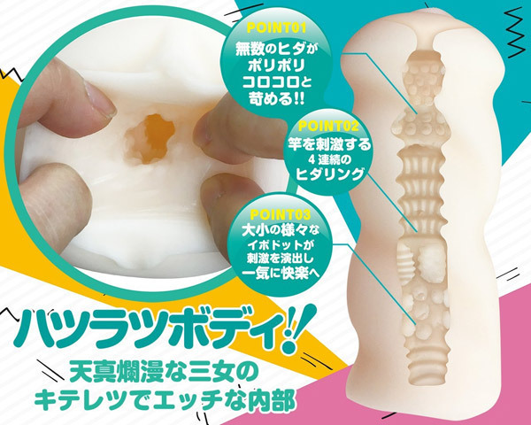 『おなガール』の血を受け継いだ新シリーズ『おなシスタ』が登場!キテレツでエッチな内部にはポリポリコロコロと苛める無数のツブを配置!中間部の4連続ヒダリングを抜けると、大小の様々なイボドット&横ヒダが刺激を演出し一気に快楽へと誘います。