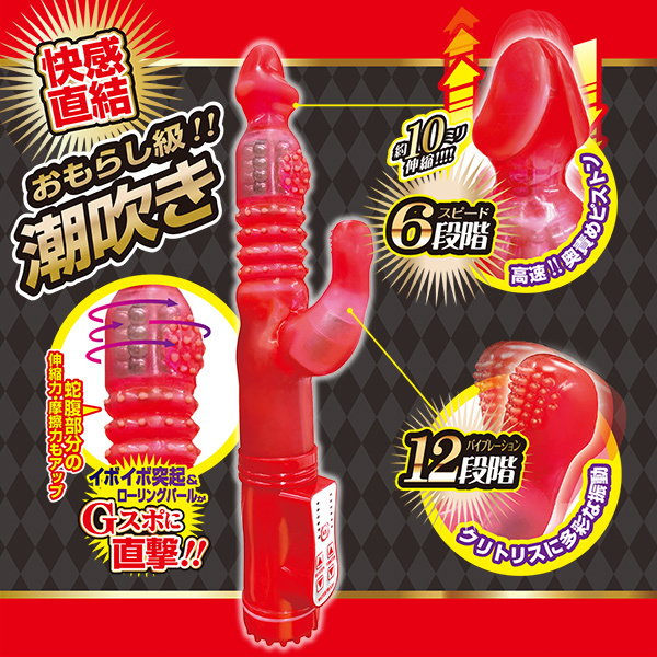 挿入部分は12.5cm(伸縮時)と奥まで届きやすく、ジャバラが伸縮して奥をガン突きするから奥イキしたい方へおすすめのバイブです♪ヘッドは挿入しやすい亀頭型で反転機能を備えたパール回転が心地よくうねり、12段階の種類を備えた子バイブの振動が奥イキだけじゃなくクリも同時にしっかりと刺激してくれます。