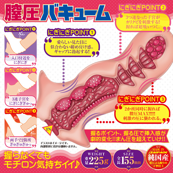握るポイントや握る圧で挿入感が変化!!にぎにぎ緩めたり締め付けたり圧をコントロールしながら、愉しむオナホール。