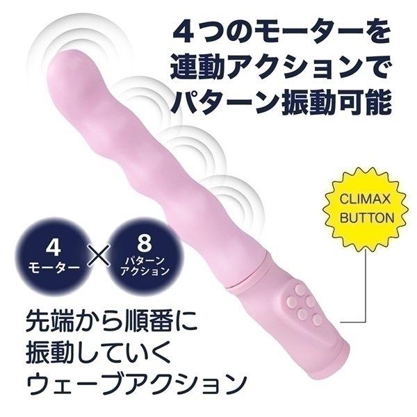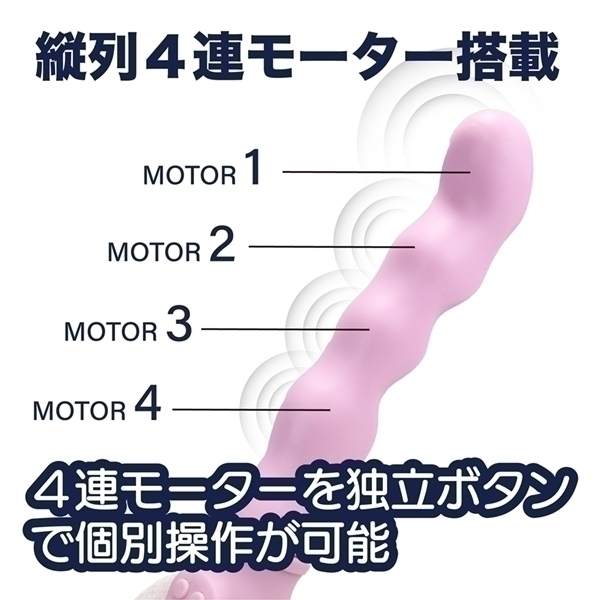 4つのモーターを搭載した高機能プレジャーアイテムです♪先端から根元まで配置されたモーターは、それぞれ個別に操作可能♪振動は3段階の強弱と5種類のパターンから選べます!先端をハイパワー振動にして、根元をリズミカルなパターン振動に設定するなど、組み合わせは自由自在♪さらに、特別なCLIMAXボタンを押すと、全モーターが一斉に振動したり、根元から順番に波打つような動きを楽しめます!本体表面には、リアルなやわらかさと滑らかな手触りを再現した特殊TPE素材を使用♪手に取るたびに、やさしいフィット感を感じられます!充電は約60分で完了し、最大90分間の連続使用が可能です♪