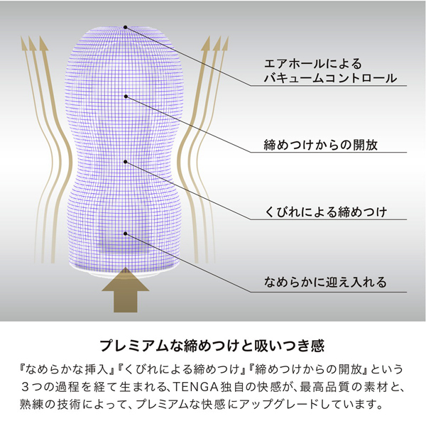 ベースとなるゲル、ウレタンフォーム、ローションなど全てが最高級品質!15年間培ってきた技術と最高品質の素材によってリニューアルした、くびれによるプレミアムな吸着感をお楽しみください。