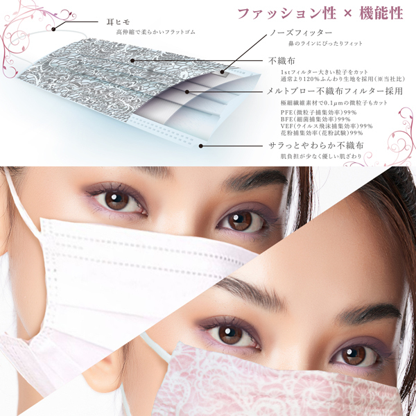 繊細な花柄レースプリントがエレガントな「マスクセレブYURIKO」は、フィルター性能試験で99%カット実証、鼻にぴったりとフィットするノーズワイヤー入りで立体プリーツ加工によってぴったりと顔まわりにフィットさせて身につけることができる、ファッション性と機能性を兼ね備えた使い捨てのおしゃれなマスクです。