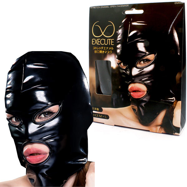 日本国内の工場で縫製され、厚手のストレッチエナメル生地を使用した目と口開きタイプのフェイスマスク。