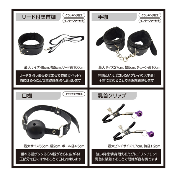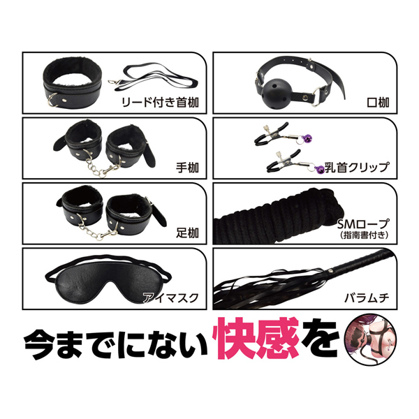 ペットのような主従感の「リード付き首枷」、本格拘束仕様の「手枷」、移動も束縛する「足枷」、暗闇が緊張感を強める「アイマスク」、垂れる涎がソソる「口枷」、悶絶で音を奏でる「乳首クリップ」、奥深さを感じる「SMロープ」、SMの代名詞「バラムチ」。