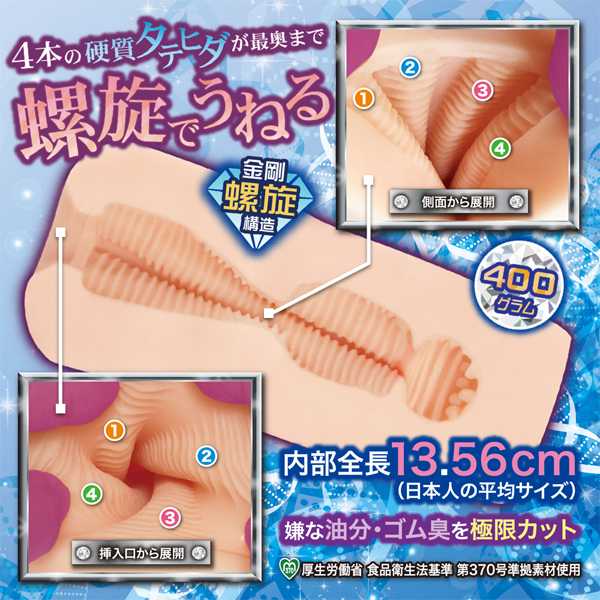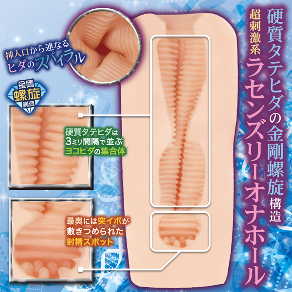 螺旋でせんずり、それがラセンズリー!ダイヤモンドラセンズリーは、4本の硬質タテヒダが「螺旋でうねる」高刺激スパイラルオナホールです。