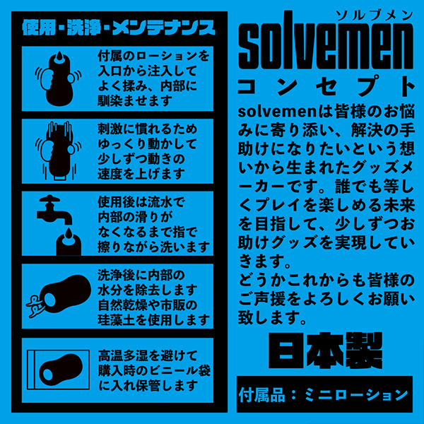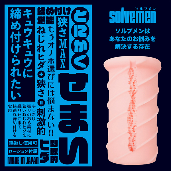 捻れたヒダ構造が特徴のホールで弾力性が高く、ハリがある素材に非貫通らしいきつきつキュウキュウとした挿れ心地を実現!硬すぎず柔らかすぎずでしっかりとした締め付けも味わえる絶妙なバランスの仕上がり♪ねじれヒダと狭さ、これらの刺激が織りなすソルブメンのコンセプト型ホールだから毎日を新鮮な気分でお楽しみ頂けます。