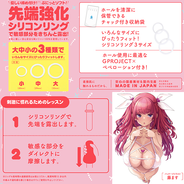 大中小3種類用意された付属のシリコンリングのおかげでいろんなサイズにぴったりフィット!優しい締め付けを味わいながらレッスンが楽しめるトレーニングオナホとなっています。