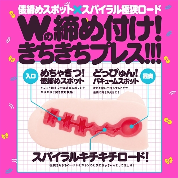 ぎゅぎゅっと締め上げ!生締まり快感!豊満肉厚BODY約480g!俵締めスポット×スパイラル極狭ロードでWの締め付け!奥にはどっぴゅんバキュームスポットを搭載!空気を抜いて挿入することで最高のきちきちプレス!直接肌に触れるものだから安心の国産素材&国内生産。