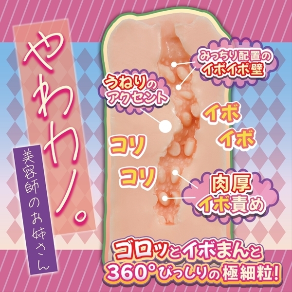 美容師のお姉さんへの淡い憧れをコンセプトにした非貫通オナホールです!柔らかくしっかりとした肉厚の内部構造が、まるでお姉さんのカラダそのものを感じさせます♪360度びっしりと配置された小粒と大粒のイボが、絶妙な刺激を提供し、挿入時の快感を高めます!S字を描く穴道と、突起が立ち並ぶ表面が心地よい抵抗感を生み、徐々に高まる快感を楽しめます♪国内生産の高品質エラストマー素材を使用しており、長くご愛用いただける耐久性も抜群!美容師のお姉さんとの秘密のひとときを感じさせる、新感覚のオナホールをぜひお試しください。
