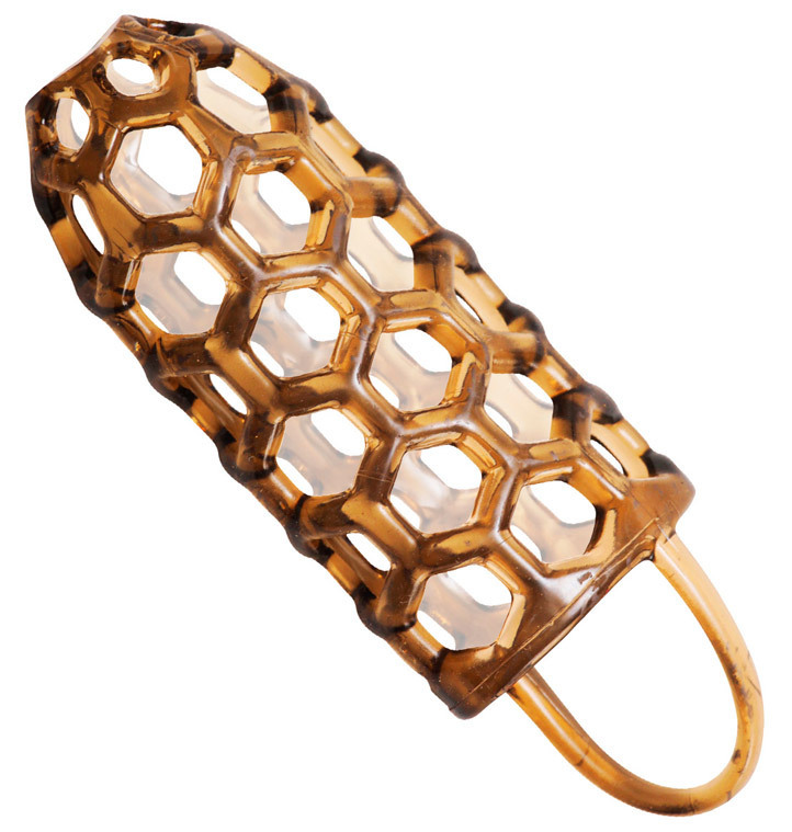 まるで蜂の巣のように規則正しいハニカム構造で竿をしっかり拘束!亀頭を露出させてカリ首を締めつけるハーフカバーとしても、亀頭をすっぽり覆うオールカバーとしても使えるオールマイティーな男性用補助グッズです。